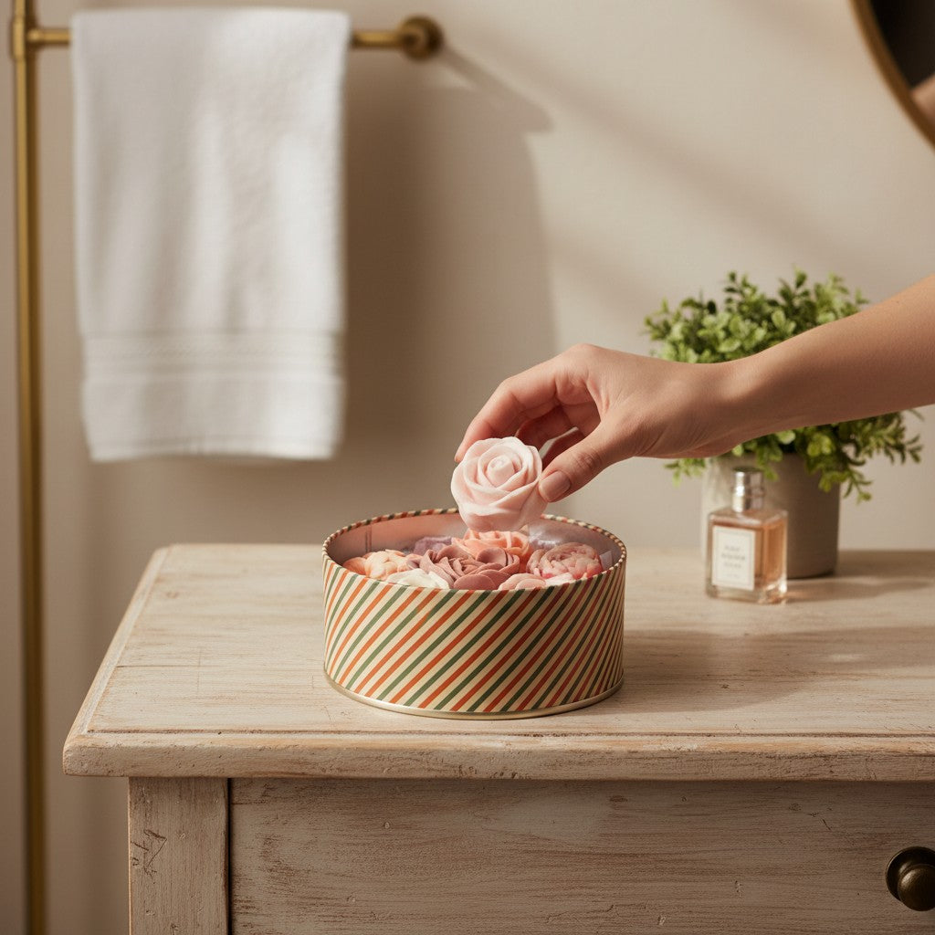 The subtle scent of vanilla and blossoms lends this set warmth and lightness. Presented in a round, festively designed metal tin – ready to bring joy and beautify any room.