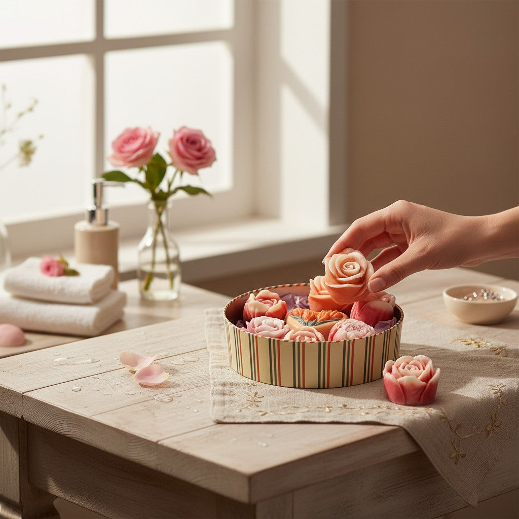 Each soap is lovingly hand-poured and features delicate tulip shapes in soft pastel shades – from rosé to white to delicate coral accents.