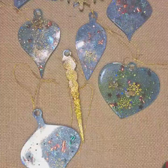 Im Set enthalten sind verschiedene Formen: Sterne, Ornamente, Tropfenformen, Herzen und eine glitzernde goldene Eiszapfenform als Highlight. Jede Figur ist ein kleines Kunstwerk, das das Licht wunderschön reflektiert und festliche Wärme verbreitet.