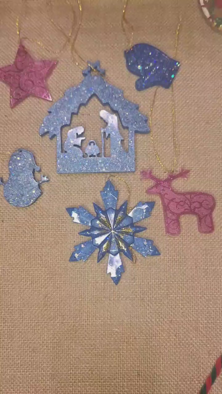 Dieses handgefertigte Set aus sechs glitzernden Epoxidharz-Anhängern verwandelt jede Weihnachtsbaumdekoration in ein funkelndes Highlight. Jedes Stück ist ein kleines Kunstwerk: perlmuttartig schimmernd, mit feinen Reliefdetails und wunderschön eingearbeiteten Glitzerakzenten.
