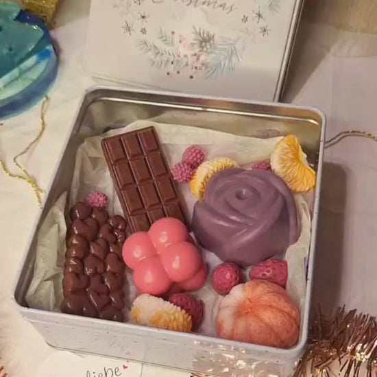 In jeder Weihnachts-Metalldose erwartet Sie eine einzigartige Zusammenstellung von Seifenfiguren – kleine Tafeln, Herzen, Beeren, Früchte und Mini-Desserts – perfekt als Geschenk oder stilvolle Deko.
