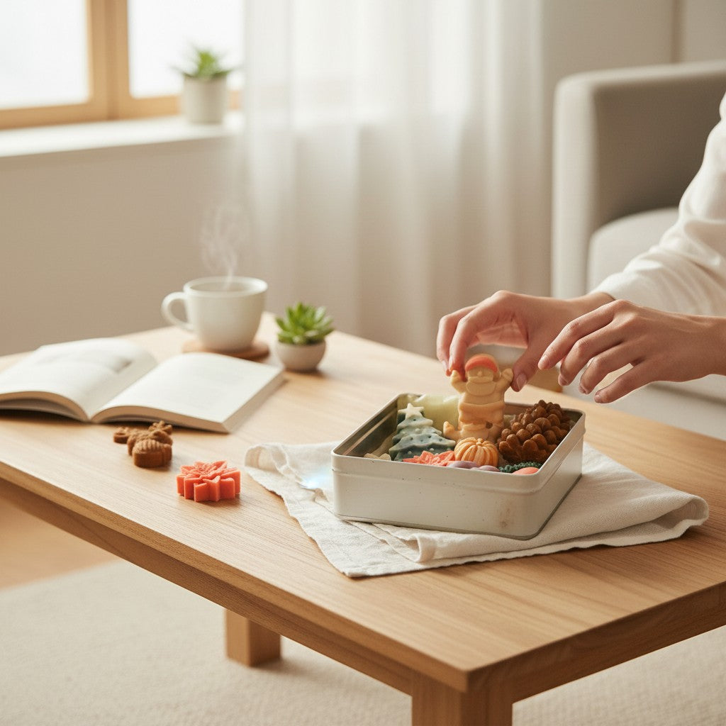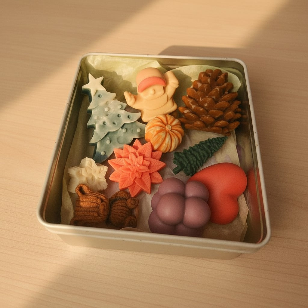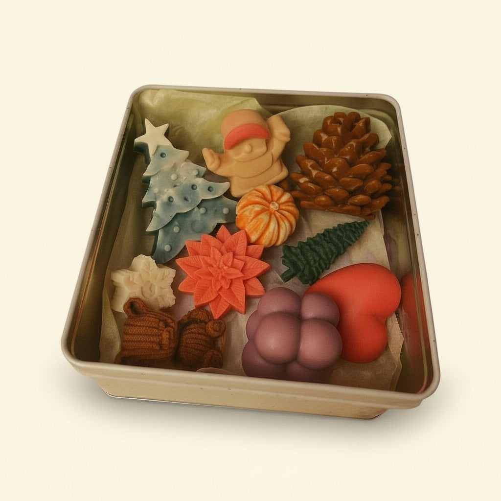 Deko-Seifenset "Weihnachtsmärchen" fängt die Magie von Weihnachten in jedem Detail ein: kleine Wichtel, Fäustlinge, Tannenbäume und Weihnachtssterne – liebevoll von Hand gegossen, farbveredelt und zu einem stimmungsvollen Ensemble arrangiert.