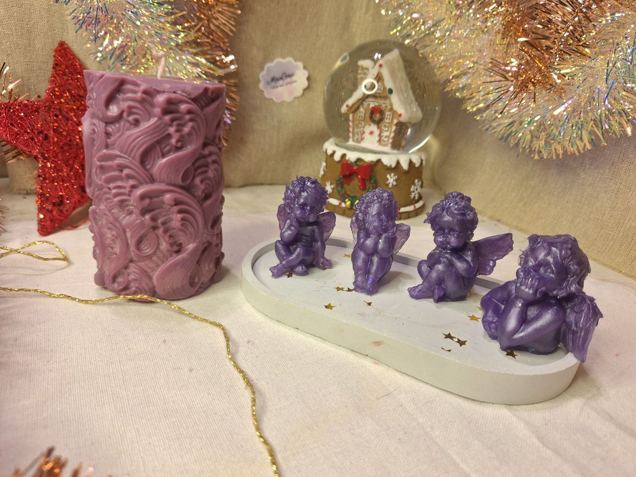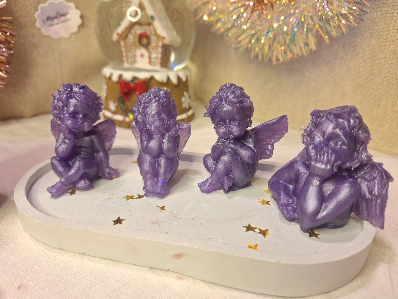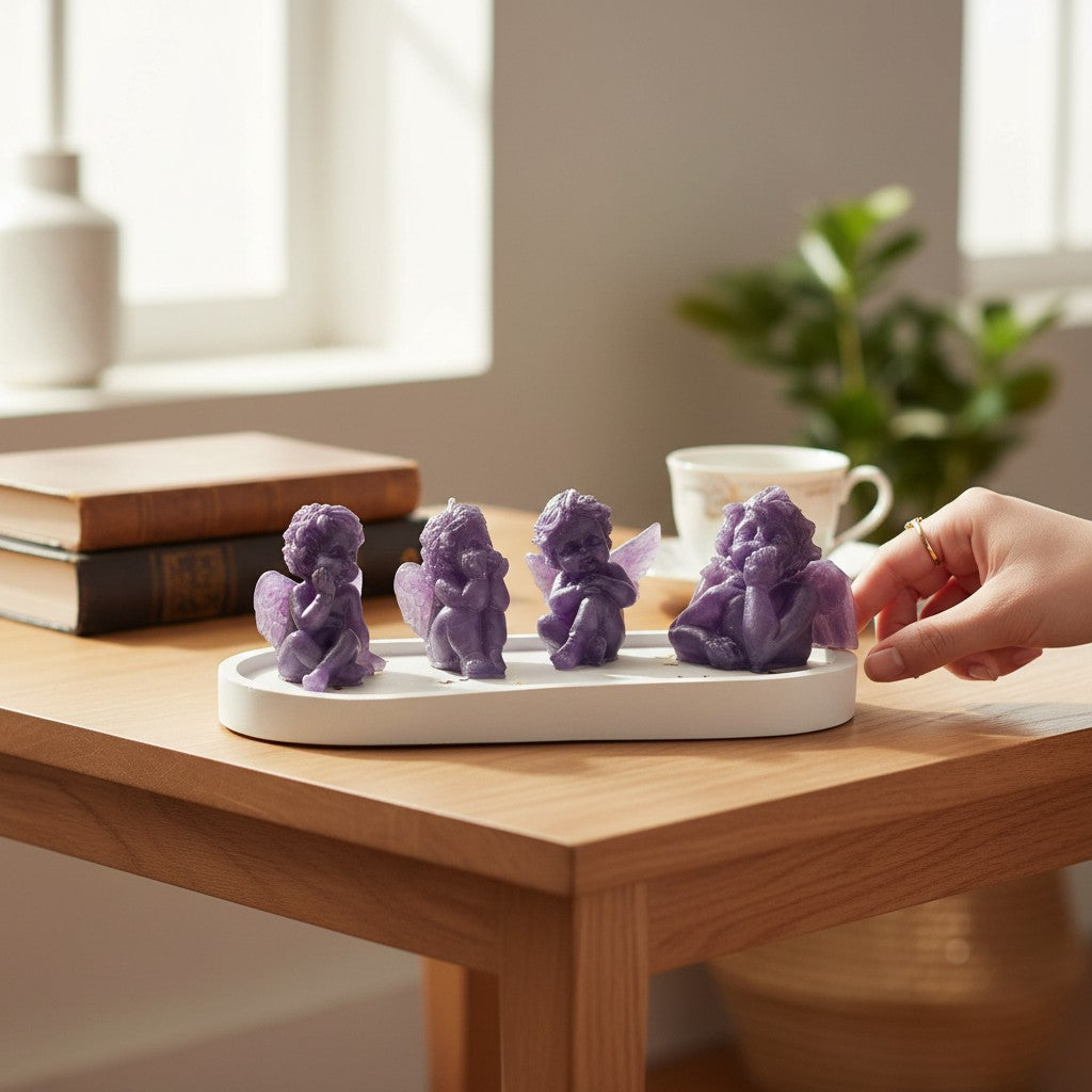 Dieses handgefertigte Ensemble verbreitet Wärme, Ruhe und festliche Eleganz. Die exquisite Sojakerze (250 g, 10 cm, 100 % Naturwachs) sorgt für ein ruhiges, gleichmäßiges Licht und schafft eine Oase der Gemütlichkeit. Begleitet wird sie von vier detailverliebten Engels-Figuren aus Epoxidharz, die mit ihrem zarten lila Perlglanz himmlische Anmut ausstrahlen. Das elegante Gipstablett rahmt die Komposition stilvoll ein.