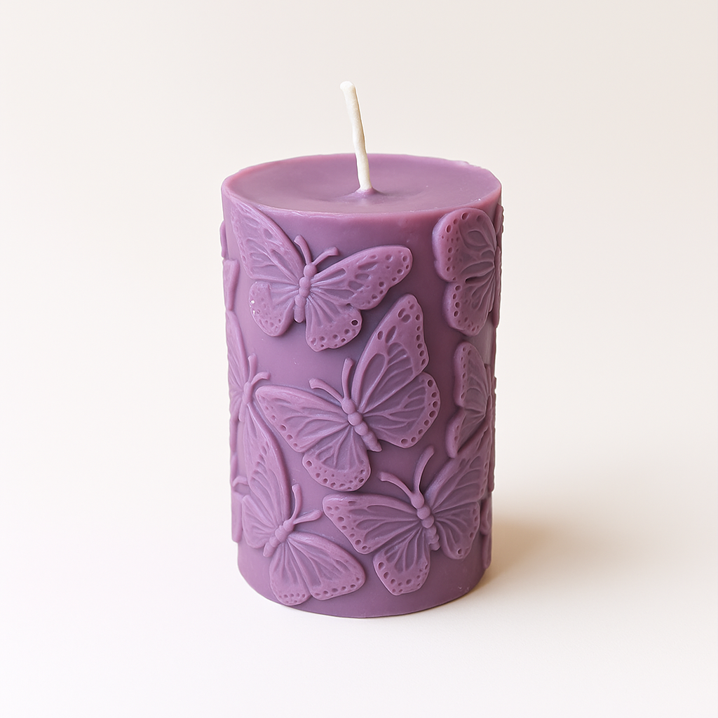 Handgefertigte Kerze „Schmetterlingstanz“ – Lila & Beige – 8 cm | Zarte Advent- & Weihnachtsdeko