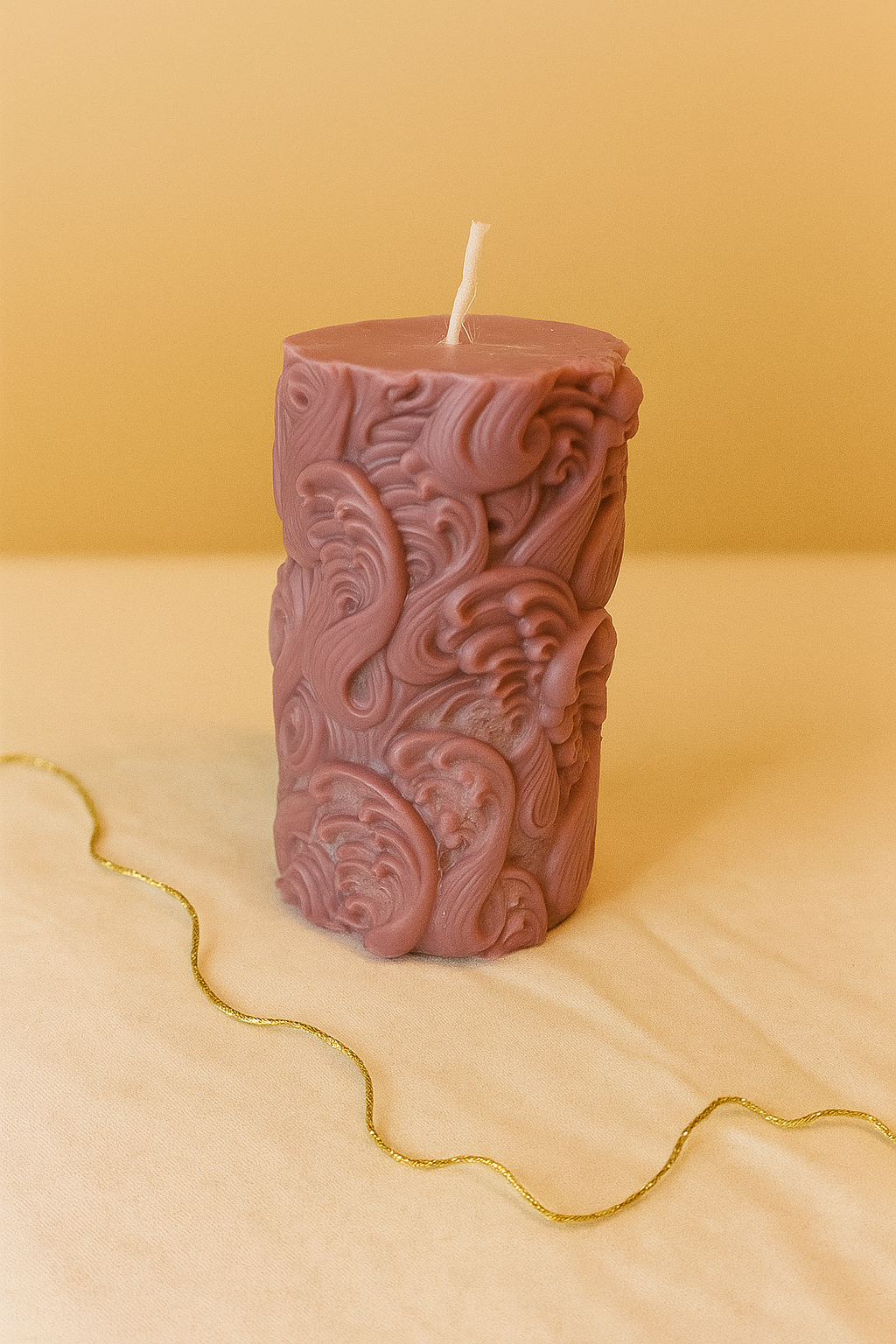 Ein kunstvolles Design in weichen, fließenden Wellen – diese handgemachte Kerze bringt Ruhe, Wärme und stilvolle Eleganz in jedes Zuhause.