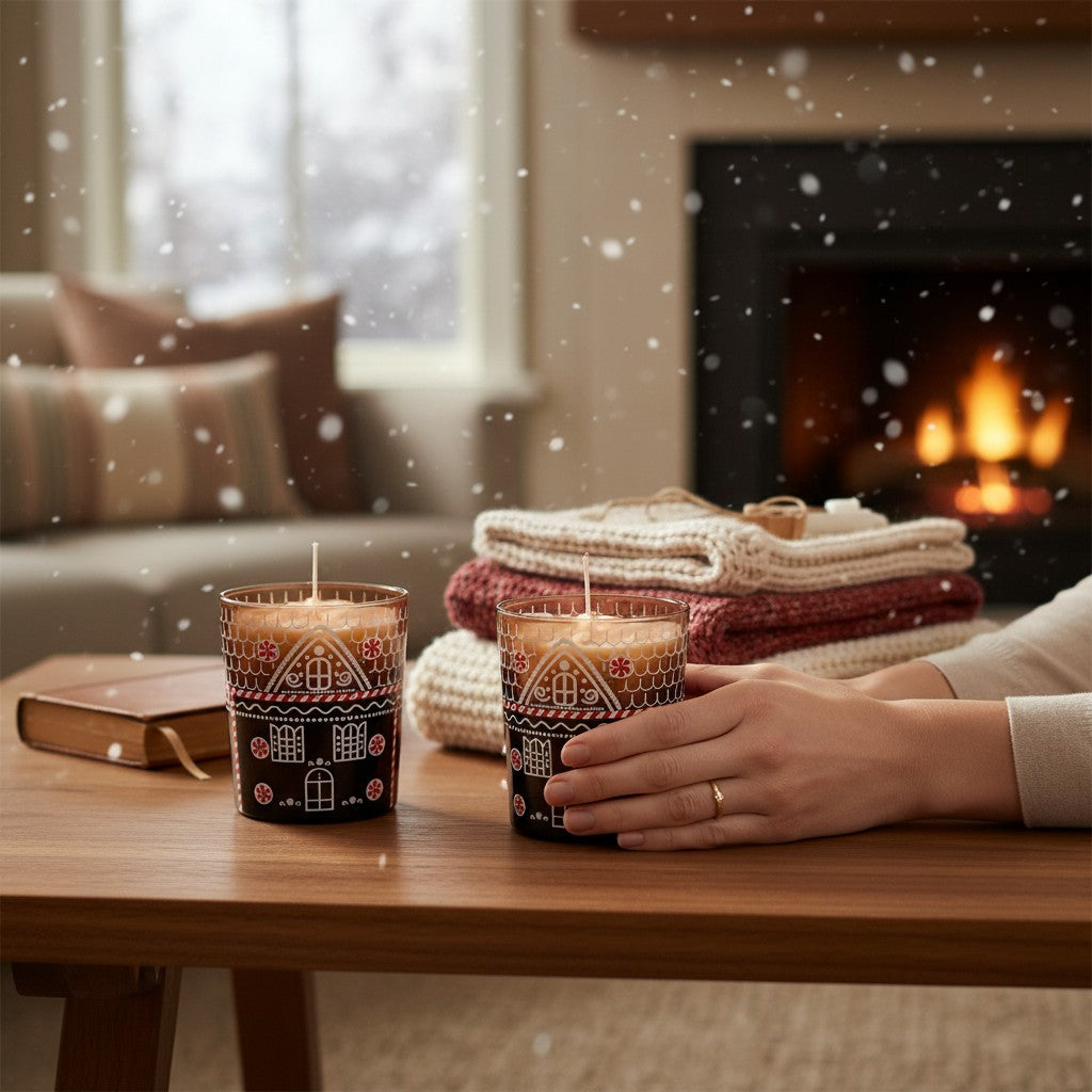 Das „Winterhäuschen Duo“ besteht aus zwei handgegossenen Glas-Kerzen in elegantem Violett. Jede Kerze ist mit einer weißen Schneeflocke aus Naturwachs verziert und in einem dekorativen Weihnachtsglas mit „Lebkuchenhaus“-Motiv gegossen. Zart, stimmungsvoll und ideal für jede Winterecke.