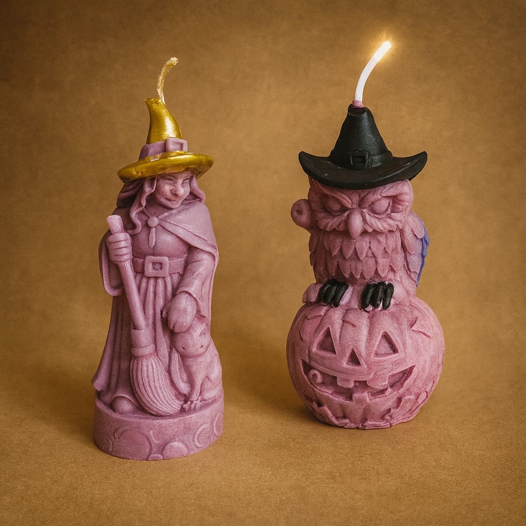 Ein magisches Duo für deine Herbstdekoration – Set aus 2 Sojakerzen „Hexe & Eule“.