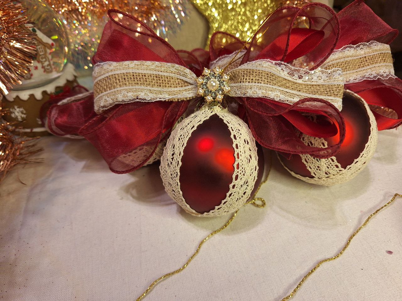 Набор «Деревенское Рождество» – 4 рождественских шара ручной работы с кружевом и натуральной лентой | Красный | 9 см