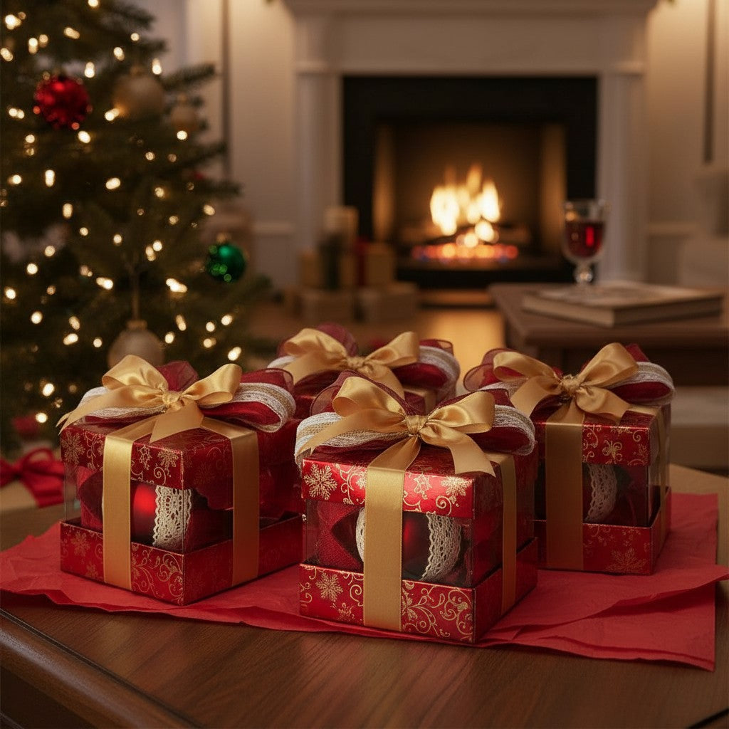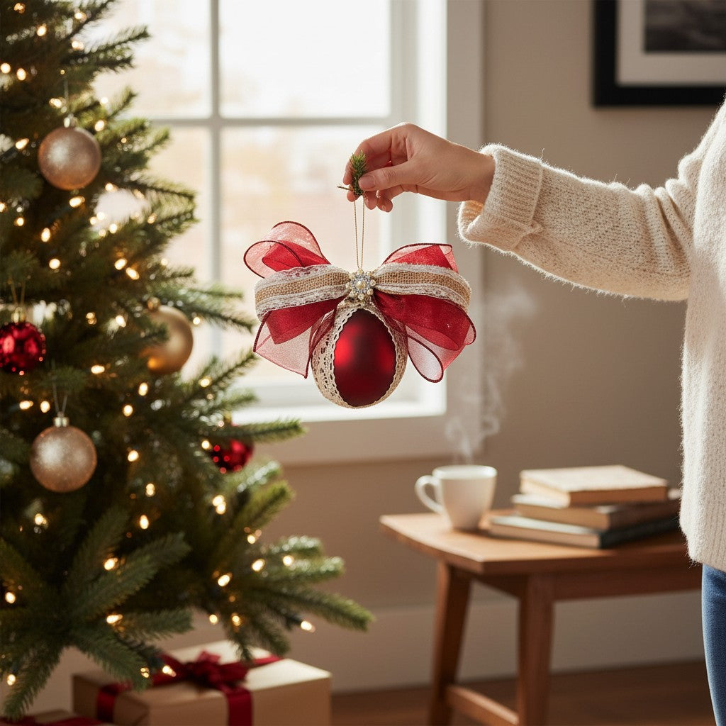 Этот набор рождественских украшений ручной работы сочетает в себе натуральные материалы и классический праздничный шарм. Красные матовые блестящие шарики украшены нежным кружевом, джутовой лентой и декоративными бантами из льна, атласа и органзы. Их деревенский вид привнесет теплую, уютную рождественскую атмосферу в любой дом – стильно, естественно и уникально. Каждое украшение – это с любовью созданное оригинальное произведение, идеально подходящее для рождественских елок, адвент-венков, украшения стола или в качестве особого подарка.